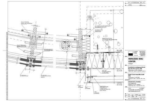 Mercedes-Benz Center guiding detail drawing: H-section: stich construction of the cone mullion with fixed glazing and connection to carcass